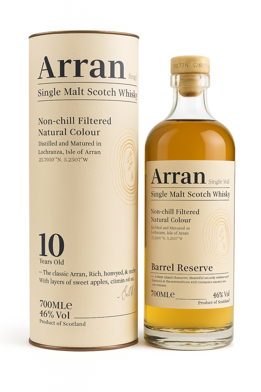 Arran 10 Years Old Non-Chill er en klassisk single malt fra Isle of Arran Distillery, kendt for sin friske og naturlige stil. Whiskyen er hverken kuldefiltreret eller farvet, hvilket bevarer dens autentiske karakter og naturlige nuancer. Efter 10 års lagring på nøje udvalgte fade fremstår den med en balanceret profil, hvor noter af søde æbler, honning, citrus og vanilje møder en blød, nøddeagtig dybde. En elegant og tilgængelig whisky, der både tiltaler nye whiskyentusiaster og garvede samlere.