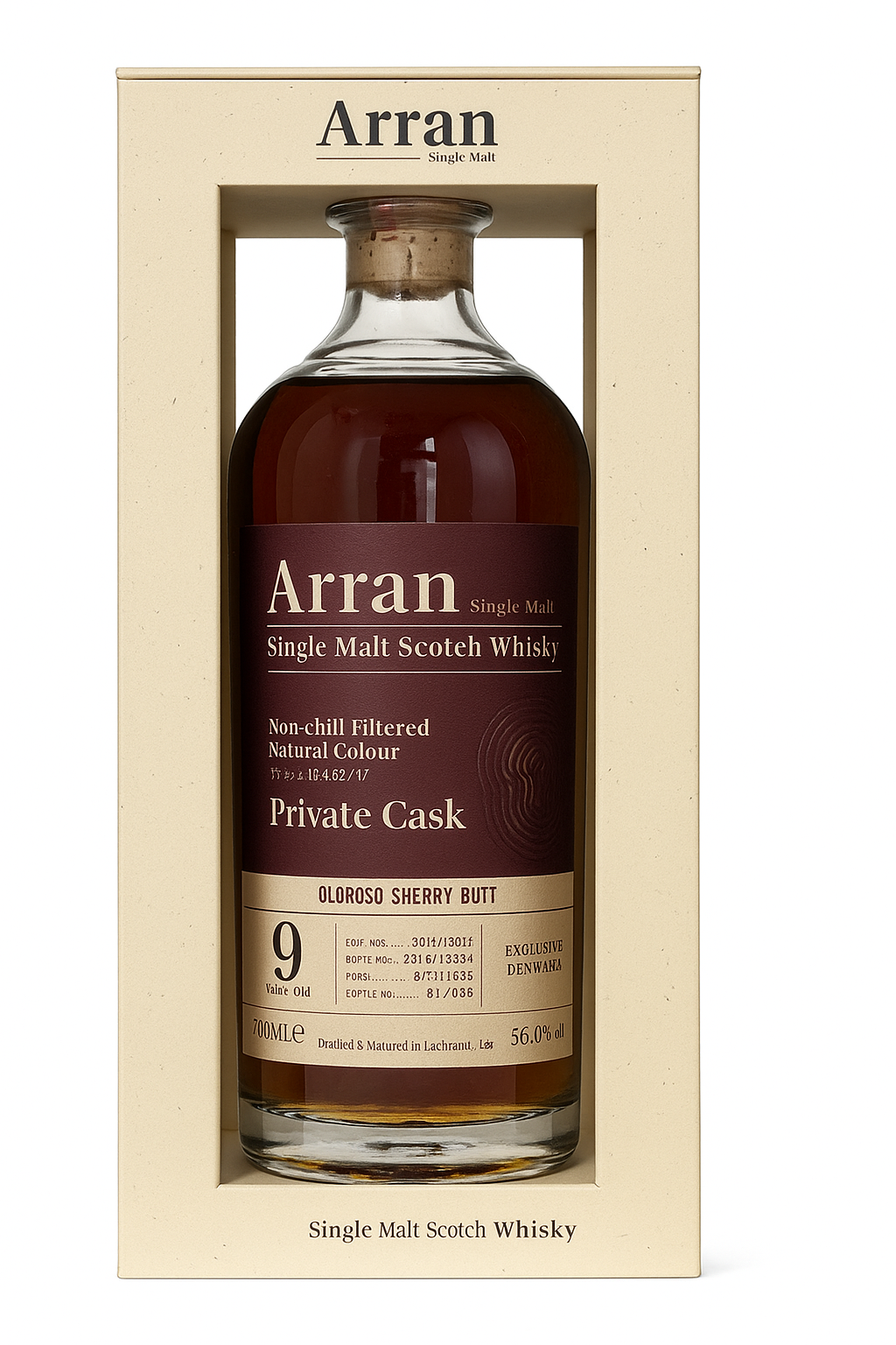 Arran 9 Years Oloroso Sherry Butt er en eksklusiv single malt fra Isle of Arran Distillery, tappet som en del af Private Cask-serien. Denne whisky har lagret hele sin modning i et oloroso sherry butt, hvilket giver en intens og fyldig karakter. Smagen byder på dybe noter af tørret frugt, rosiner, mørk chokolade, krydderier og en antydning af ristede nødder, afrundet af en varm, lang eftersmag. Whiskyen er aftappet ved fadstyrke, hvilket giver en kraftfuld og autentisk oplevelse – uden kuldefiltrering og uden tilsat farve. En sjælden og eftertragtet whisky, eksklusivt tappet i begrænset antal.