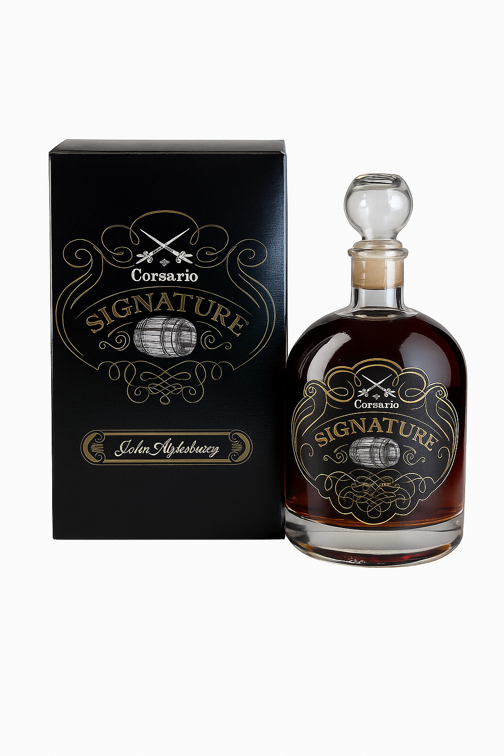 Corsario Signature er en eksklusiv rombaseret spiritus, præsenteret i en elegant karaffel med gaveæske, hvilket gør den til et oplagt valg til særlige anledninger eller som gave. Denne Signature-udgave er skabt på nøje udvalgte fade, der giver en dyb og fyldig smagsprofil.