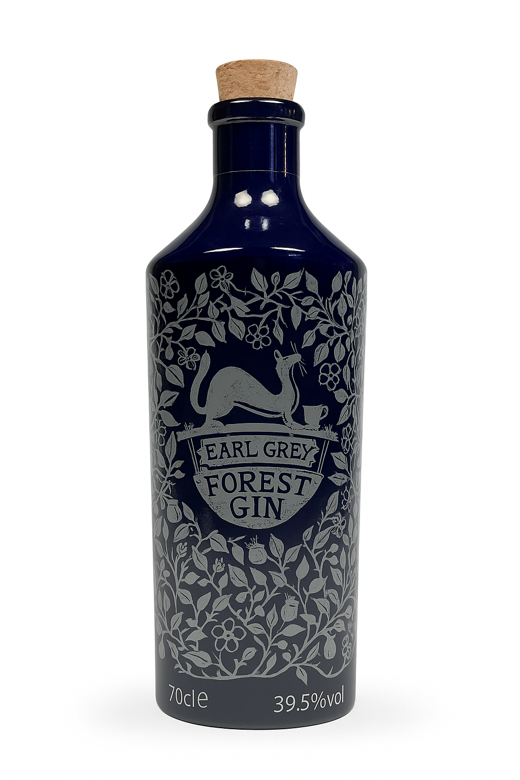 Den smukke, mørkeblå keramikflaske med naturinspireret design understreger det håndværksmæssige og unikke præg, som Forest Gin er kendt for.