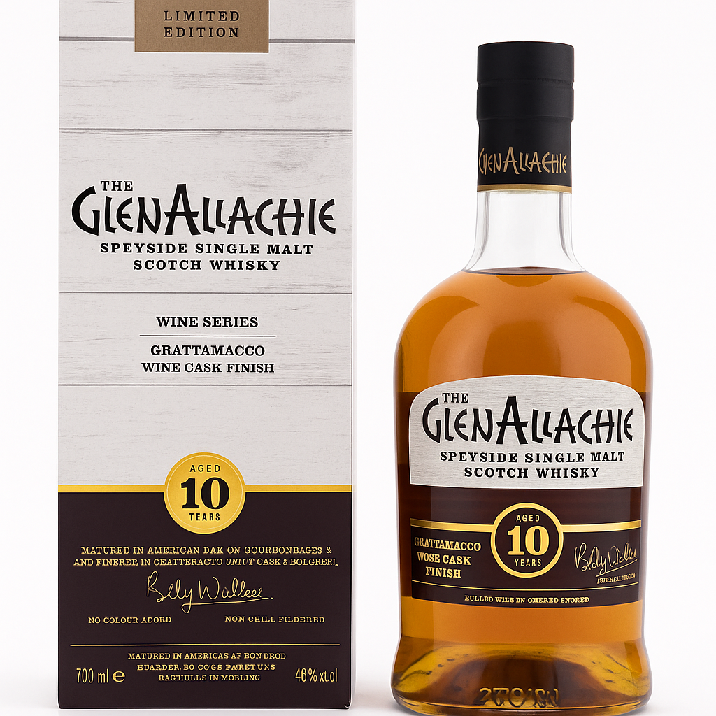 The GlenAllachie 10 Years Grattamacco Wine Cask Finish er en del af destilleriets eksklusive Wine Series. Denne Speyside Single Malt har først lagret på amerikanske bourbonfade, før den har fået en raffineret afslutning på Grattamacco-vinfade fra Bolgheri i Toscana, Italien. Resultatet er en kompleks whisky med noter af modne røde frugter, mørk chokolade, egetræ og et strejf af krydret sødme. Grattamacco-finishen tilfører en elegant vinøs karakter, som giver whiskyen en unik dybde og balance. En limited edition for samlere og feinschmeckere.